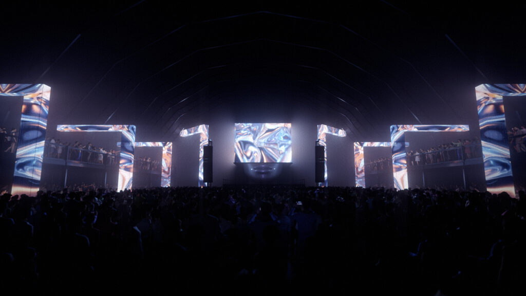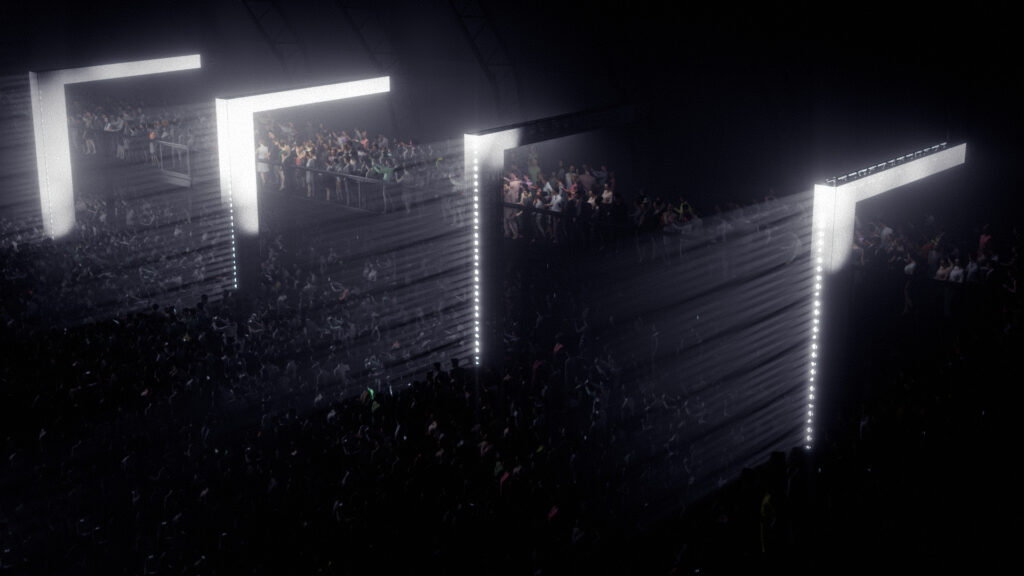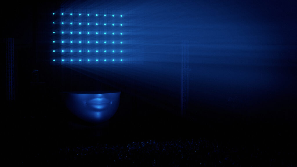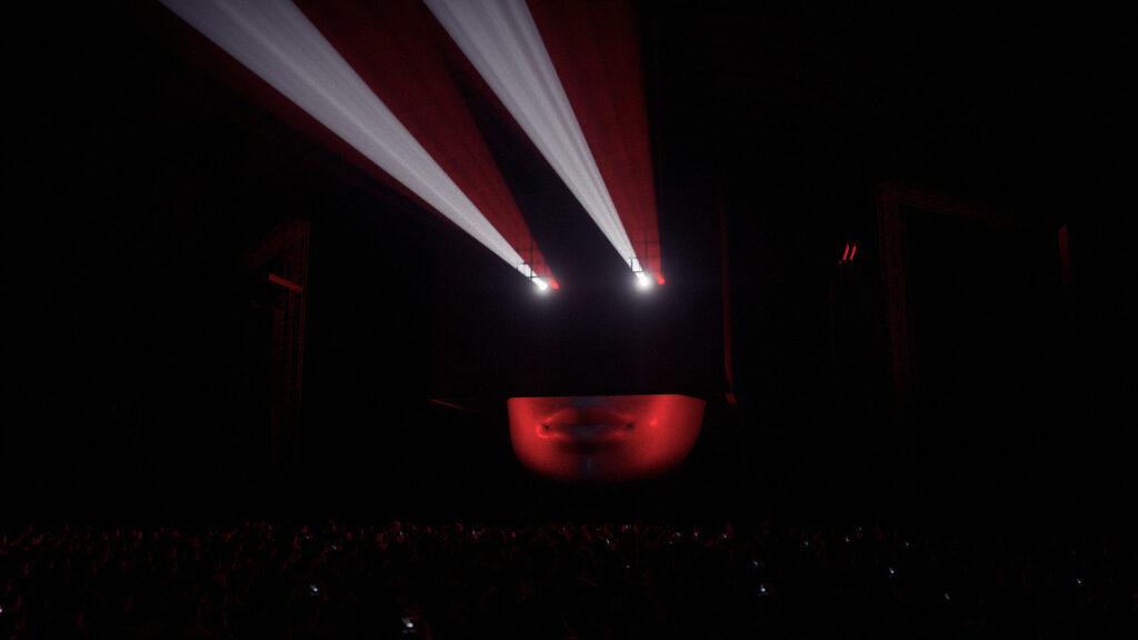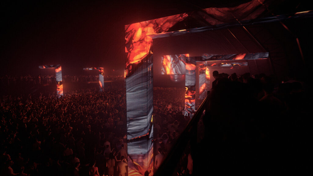 For Mysteryland Hardstyle Elite, commissioned by Rene Studio, I created the full 3D stage visualisations. The design features a massive sculptural face topped with a dynamic LED cube, backed by powerful light arrays and framed by LED arcs sweeping over the balconies.